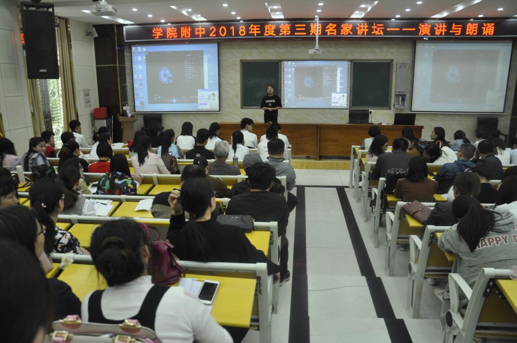 4月18日下午,全体教师齐聚阶梯教室,一起聆听了《演讲与朗诵》专题讲座。本次讲座特邀濮阳市创建“中华诗词之市”专家组组长、河南省演讲与口才学会副会长、《演讲与口才》杂志社顾问、全国演讲赛事评委专家组成员、全国演讲与口才学会联盟副主席许清林先生。