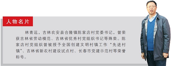 为改变陈家店村贫穷落后的面貌,2005年吉林农安县合隆镇党委经反复研究,决定让农民企业家林青远担任陈家店村党总支书记。面对陈家店村实际,林青远临危受命,内心暗自发誓,不能辜负党组织的重托、村民的希望。上任伊始,他立即忙碌起来:组建村党组织班子,召开村“两委”会、党员大会和村民代表大会,广泛征集农村发展建议;邀请省规划设计院专家来访实地考察,量身制定10年发展规划。在众人惊讶和怀疑的目光中,敢为人先的林青远大胆提出,要通过集资方式,盘活村里停产多年的红砖厂。